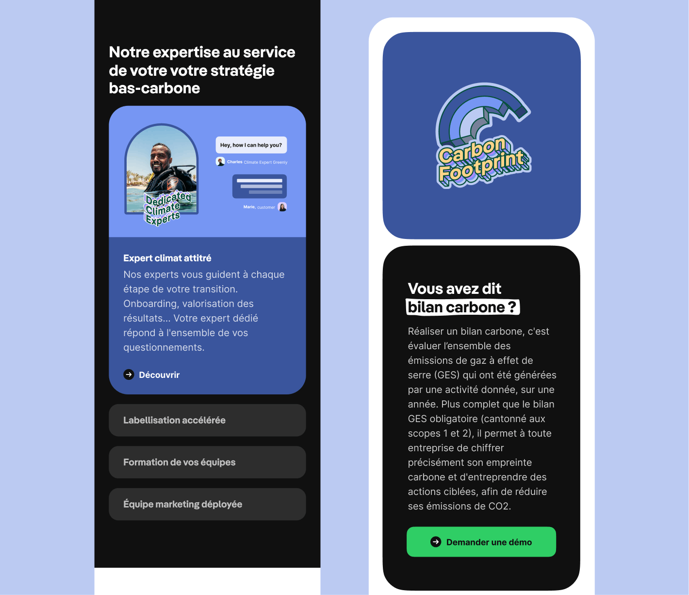 To enhance the community aspect, stickers and illustrations invite users to embrace the visual universe. The website, both engaging and functional, facilitates businesses' ecological transition with refined animations and a design adaptable to all platforms.