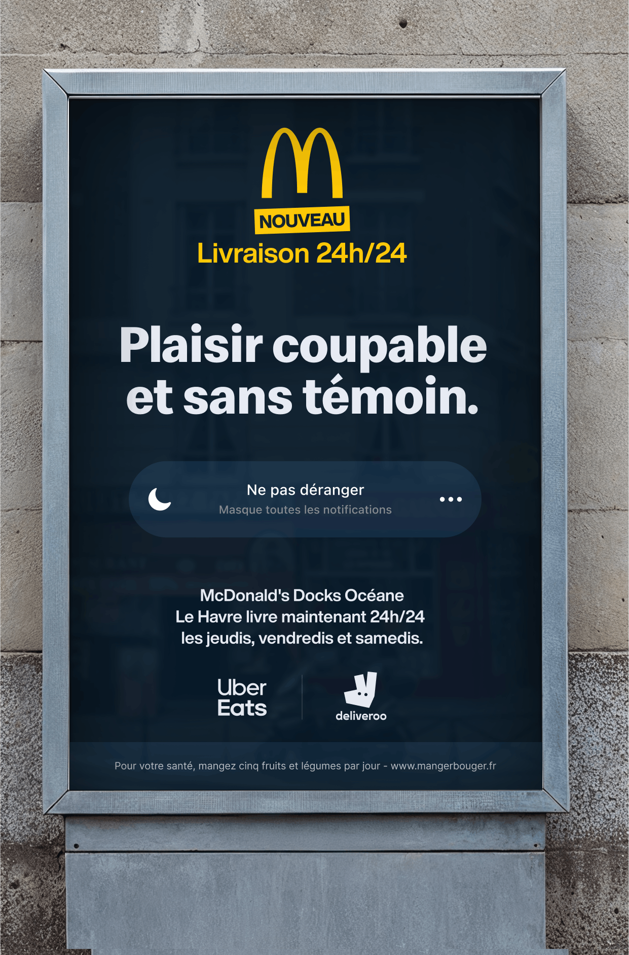 McDonald’s Le Havre Docks and McDonald’s Grand Quevilly have launched 24 hours home delivery; Bruno was given full creative freedom to design an outdoor campaign that would resonate with a wide audience, from students to night-shift workers.