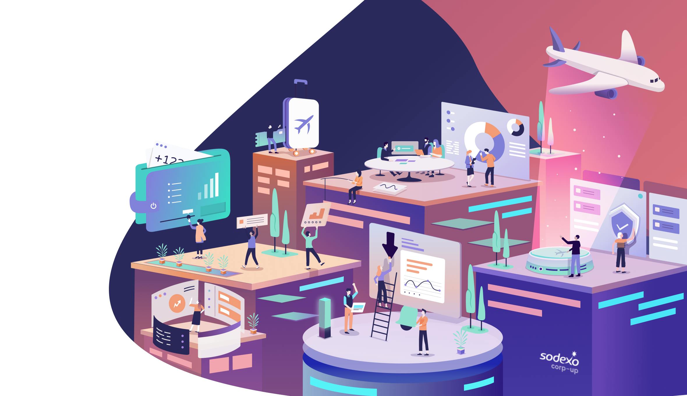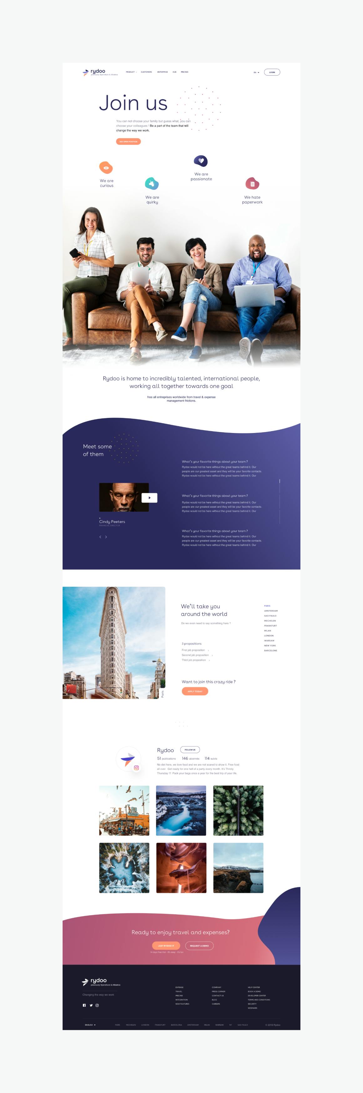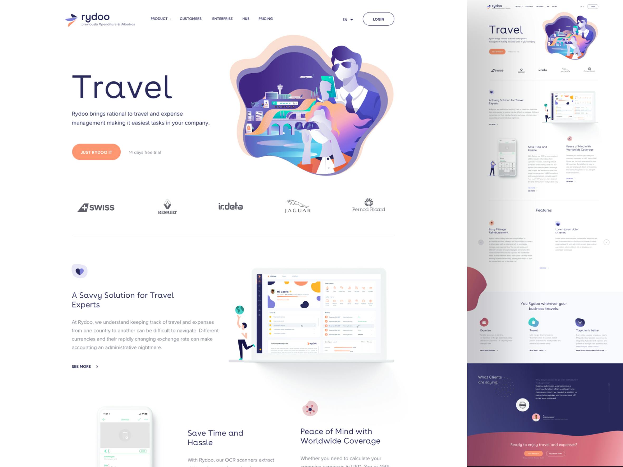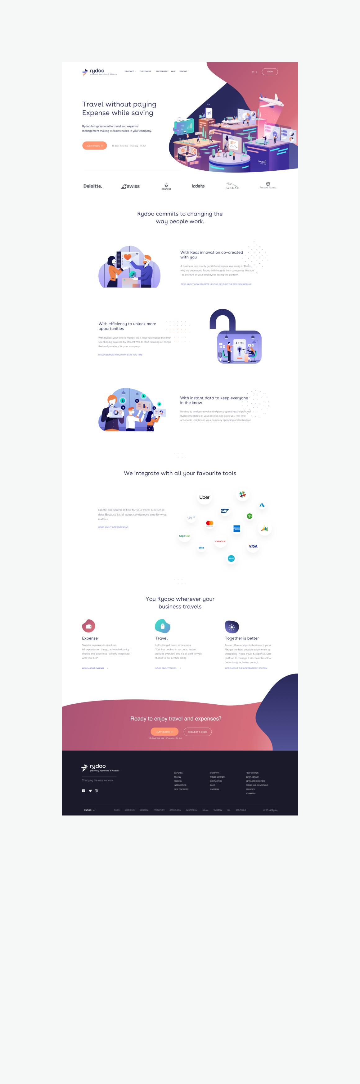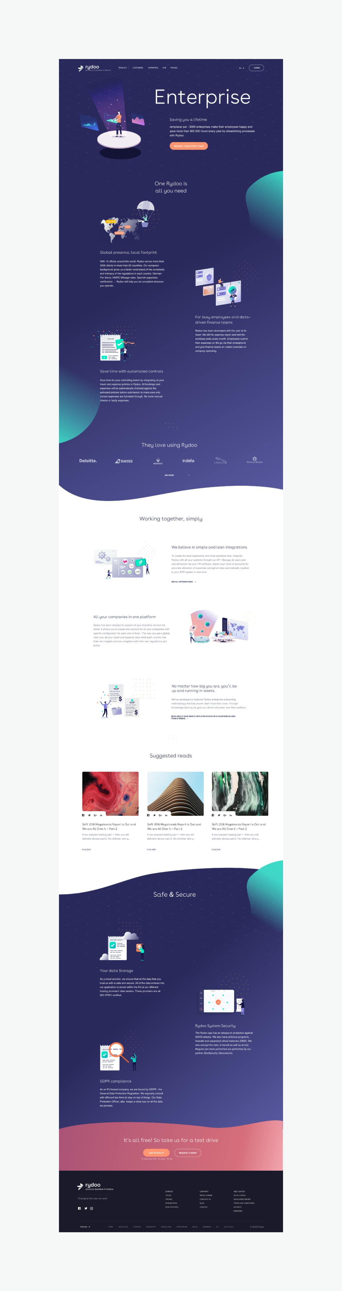 Rydoo rises above, stays ahead, and projects users into a futuristic and innovative management universe with this first illustrated style. The various proposals compete in inventiveness and details to showcase the product's advantages.