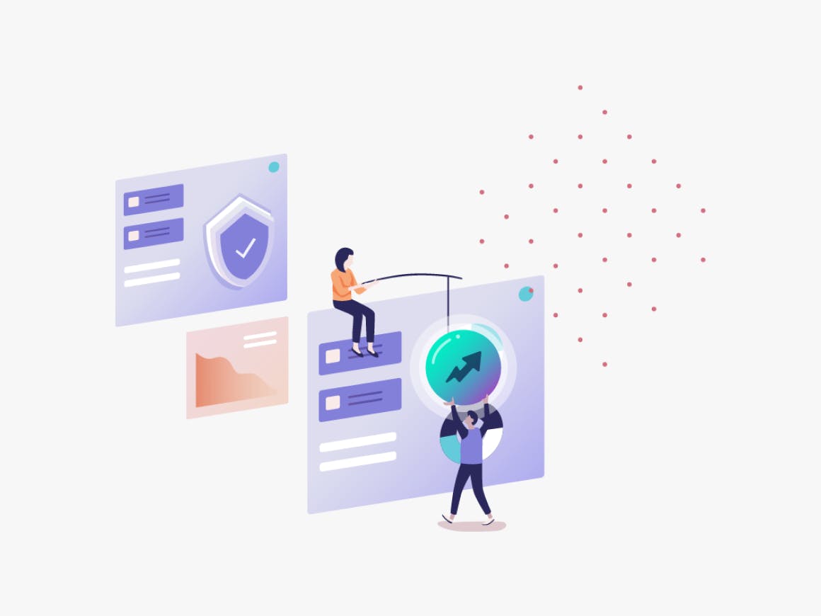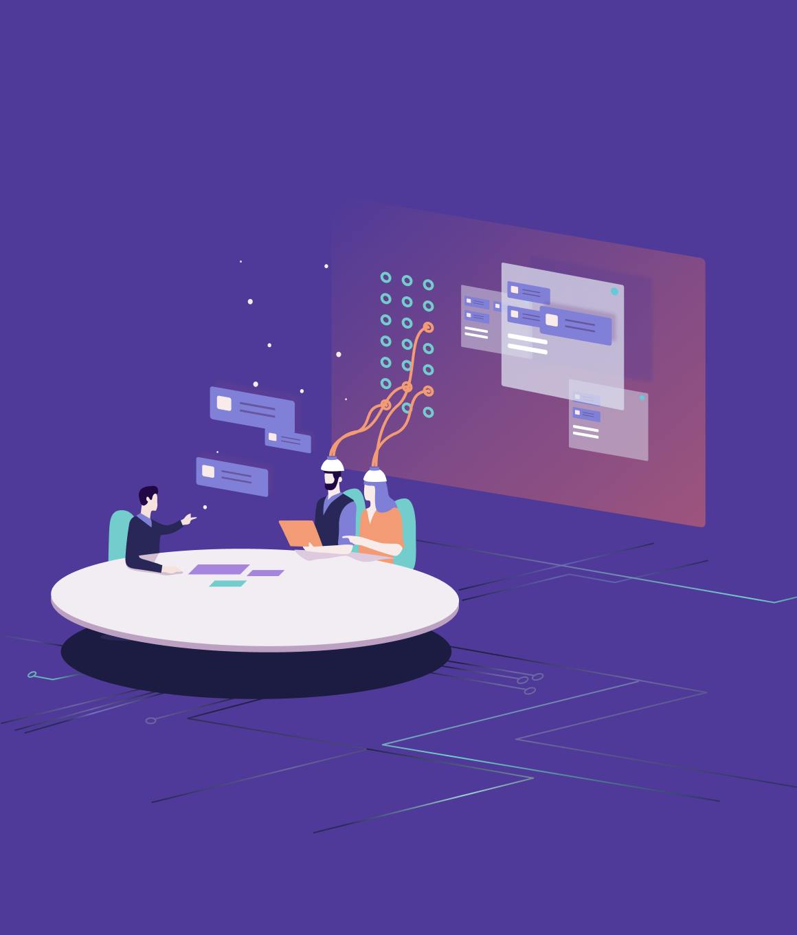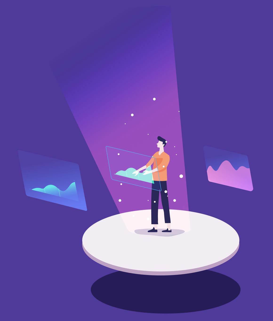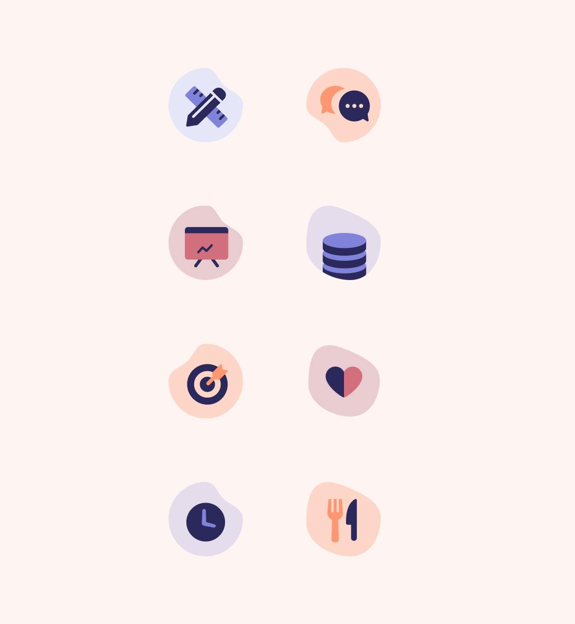 This second figurative style combines round shapes and zoomed-in characters in elaborately designed backgrounds. The background elements evoke more well-being and projection rather than technical content and functionalities.