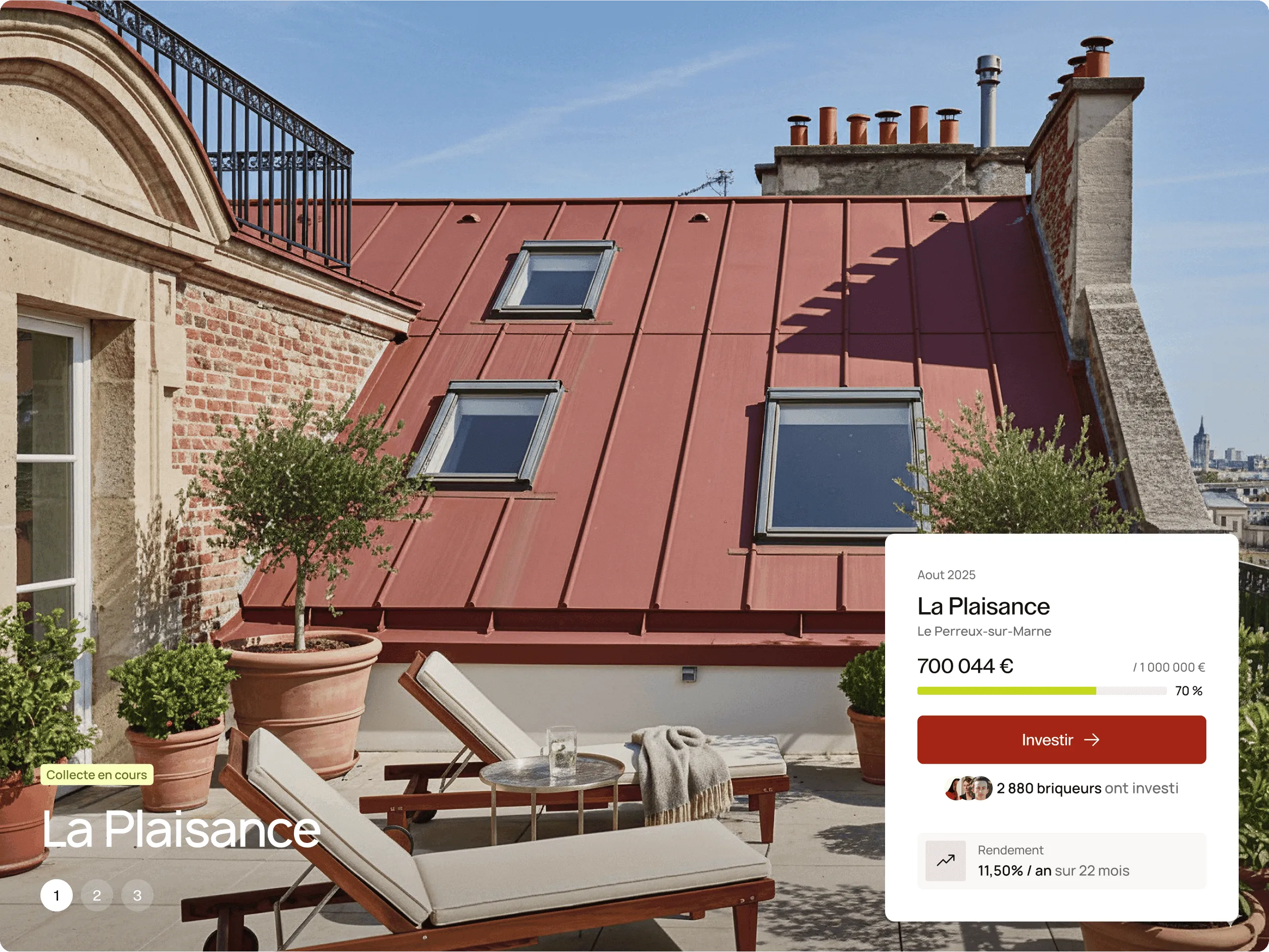 La direction artistique s’inspire des codes de la construction et de la finance : un rouge hérité de la brique, des formes architecturales, un logo qui symbolise le collectif, et des animations 3D pour incarner le rendement et la progression.