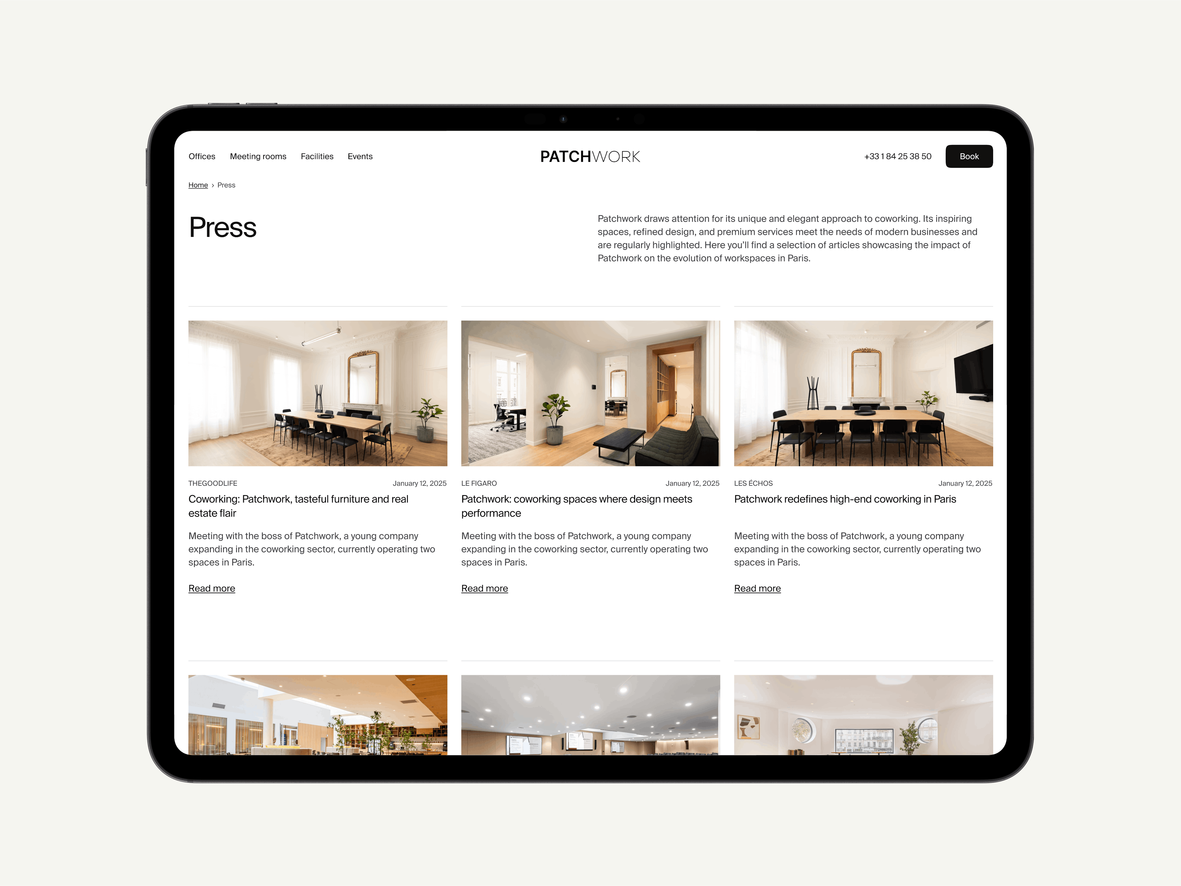 Nous avons repensé l'ensemble de leur image de marque - branding, design, site web, UX et UI - afin de révéler la richesse de leur offre et d'affirmer un positionnement clair. Patchwork ne se contente pas de louer des espaces de travail : ils conçoivent, aménagent et proposent des bureaux sur mesure. Nous avions besoin d'une plateforme à la hauteur de leurs standards, où la réservation d'un espace soit aussi simple qu'attrayante.