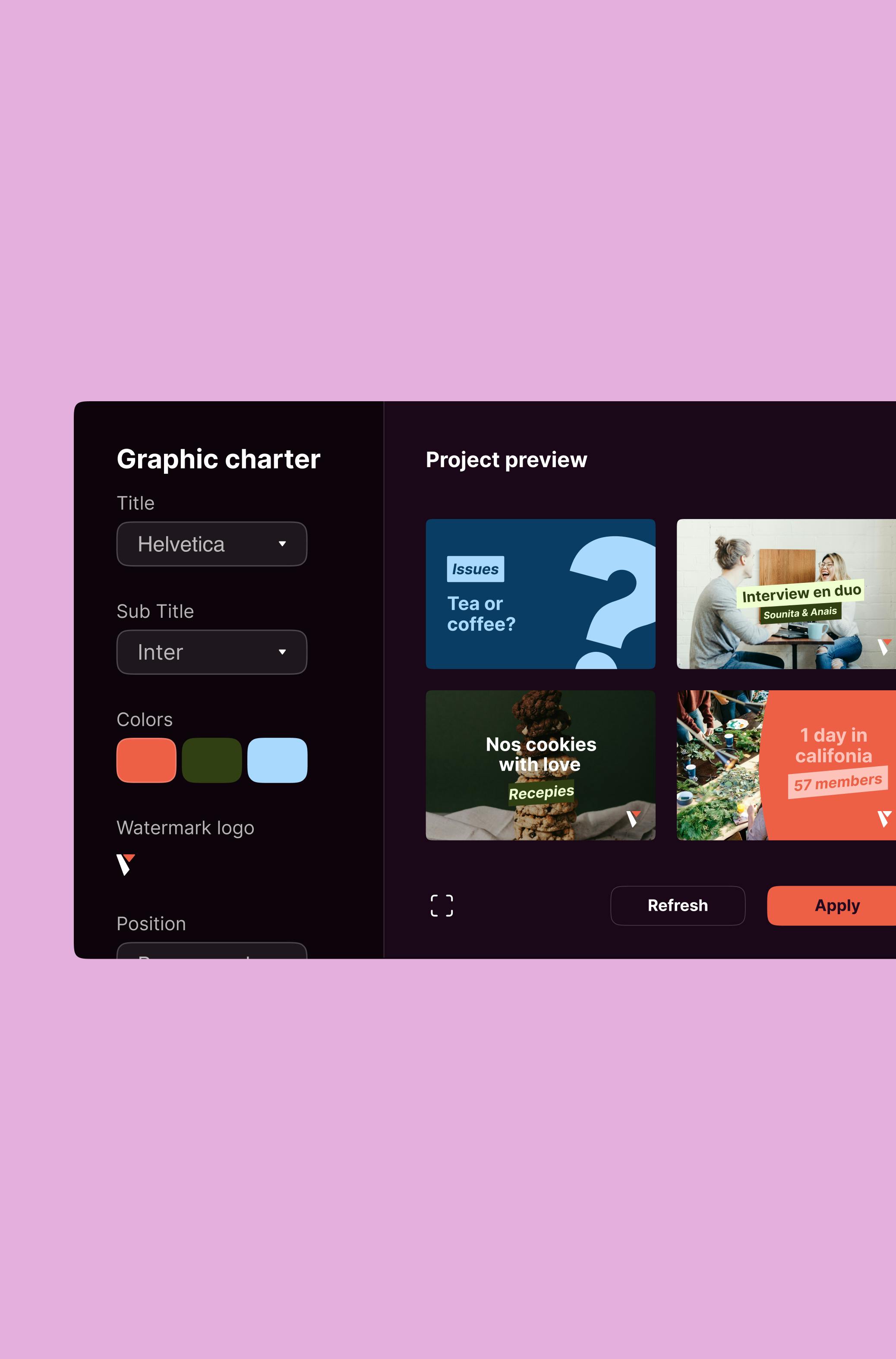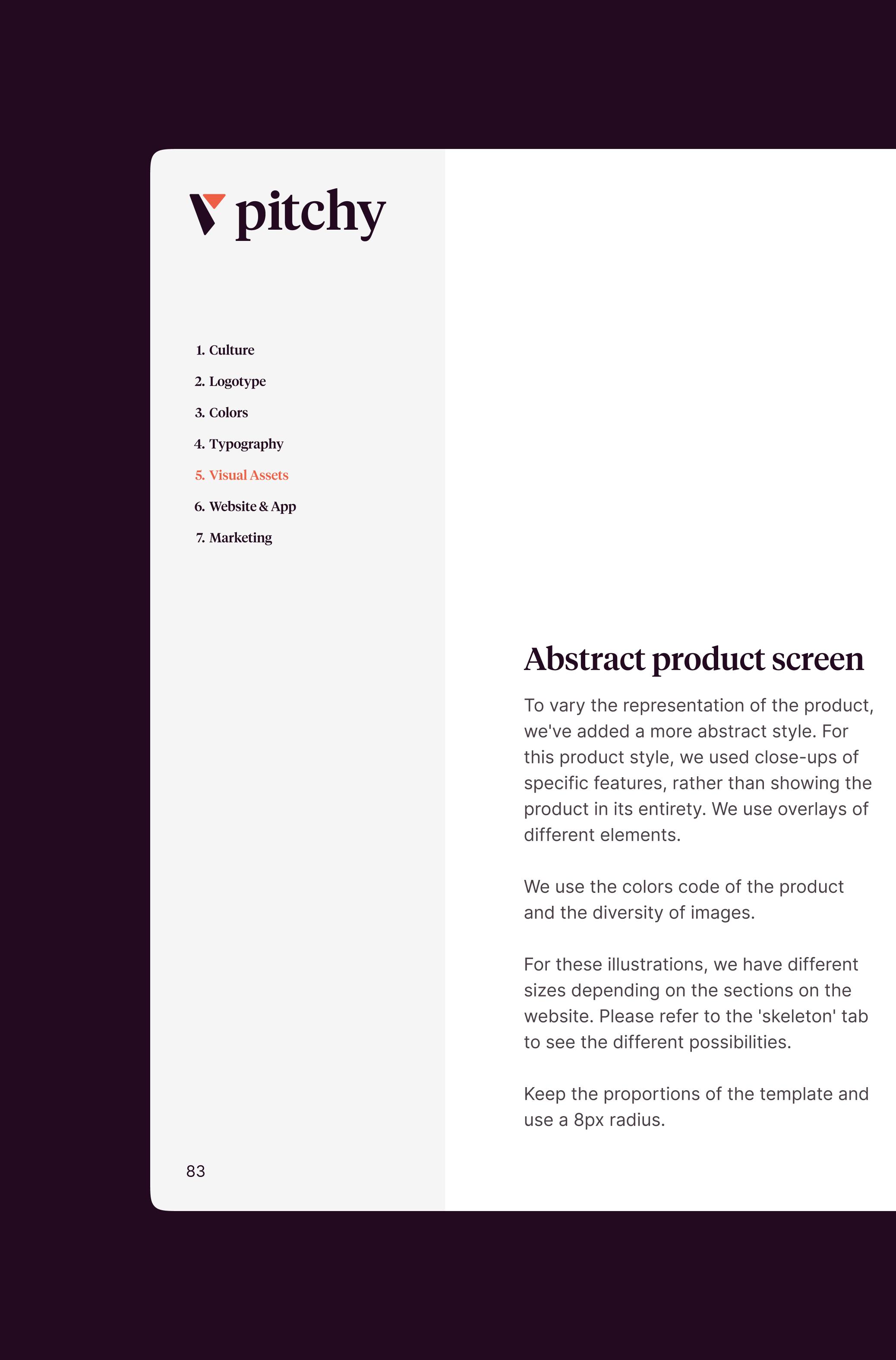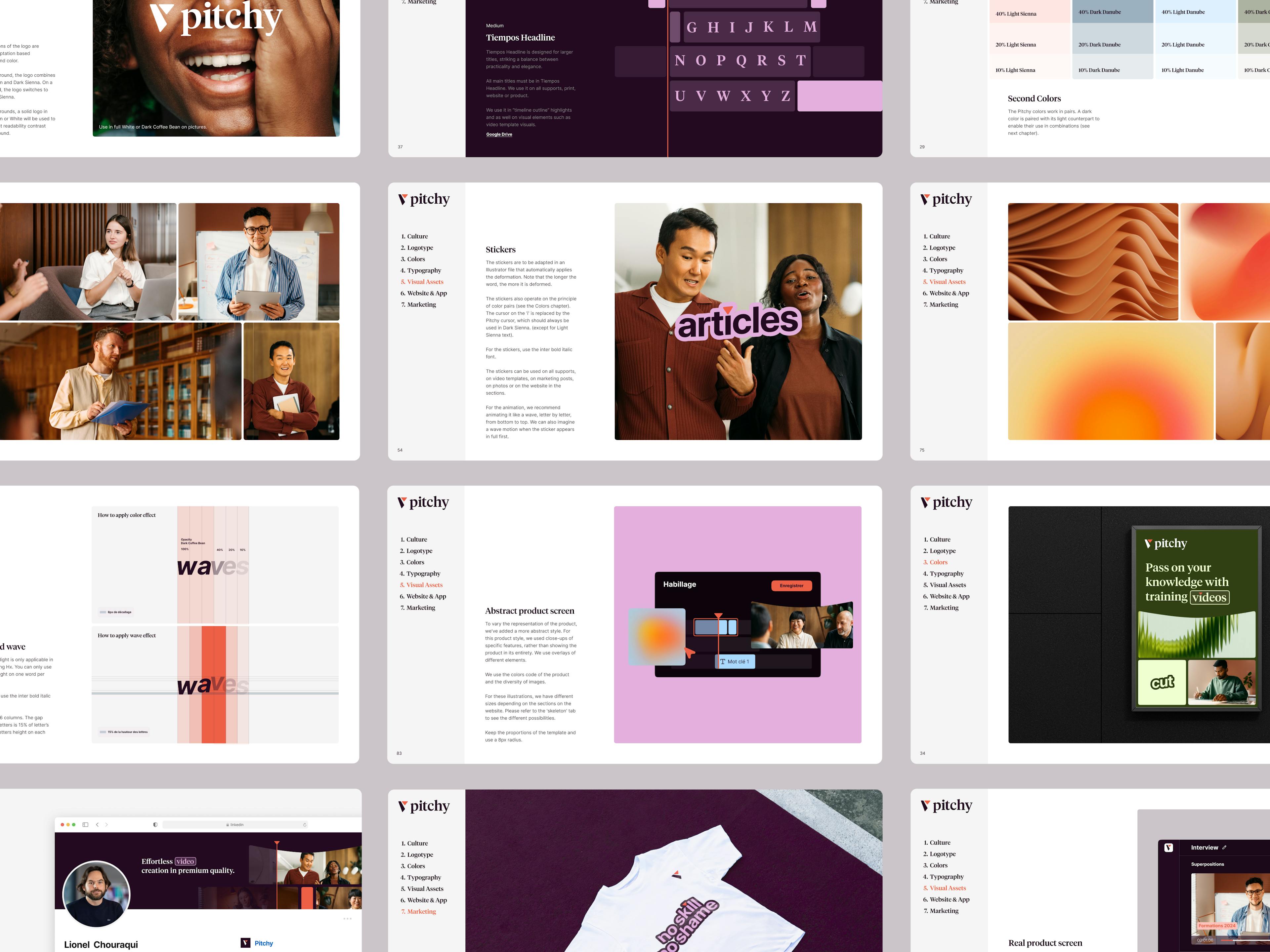 Inspirée par le mode sombre, la direction artistique adopte un violet profond, rehaussé de couleurs vives, positionnant Pitchy comme une solution haut de gamme aux finitions soignées. Le curseur de timeline, élément emblématique du montage vidéo, a été intégré au logo, formant la boucle du “P” de Pitchy, et se décline comme un repère graphique à travers toute la marque.