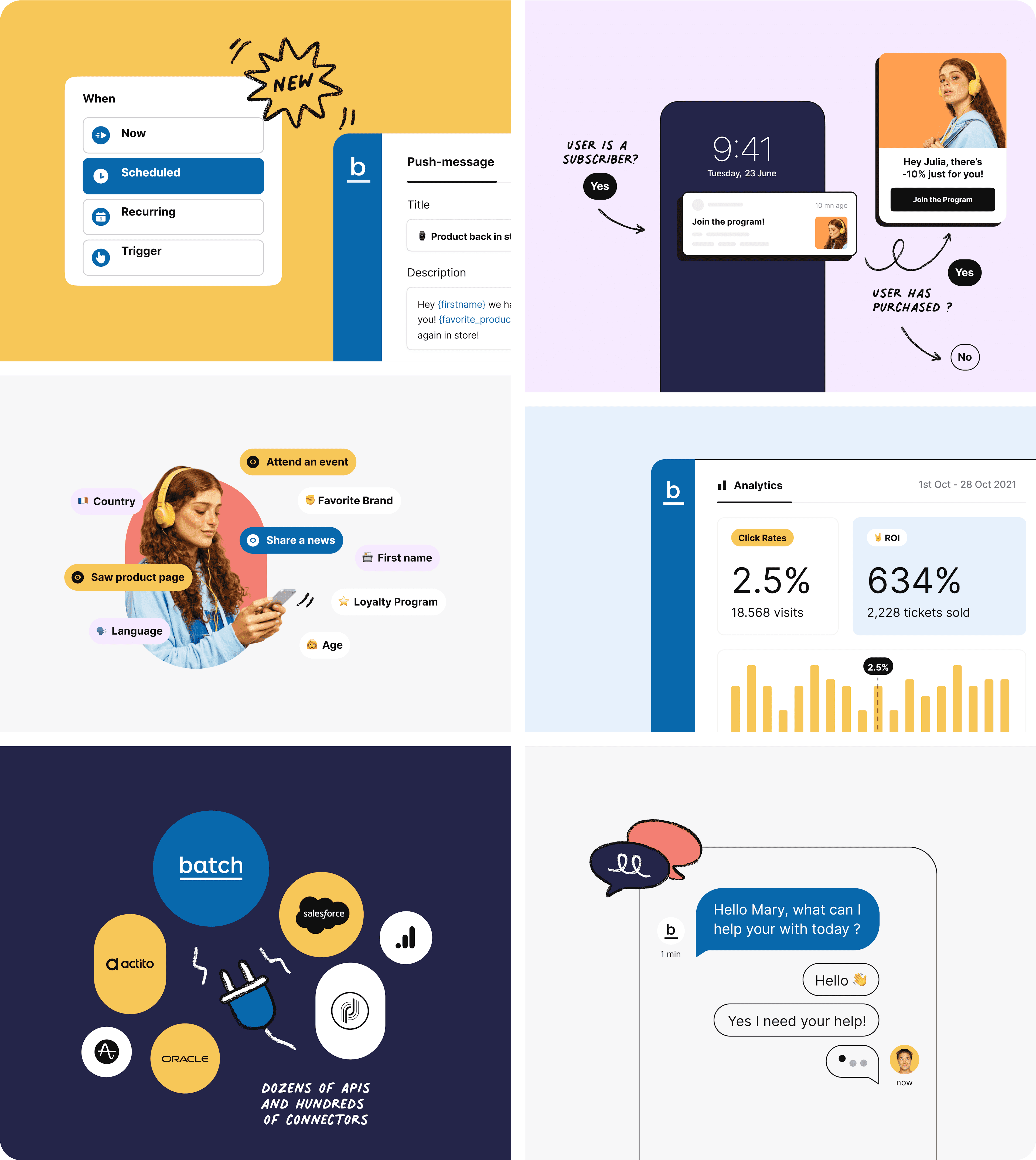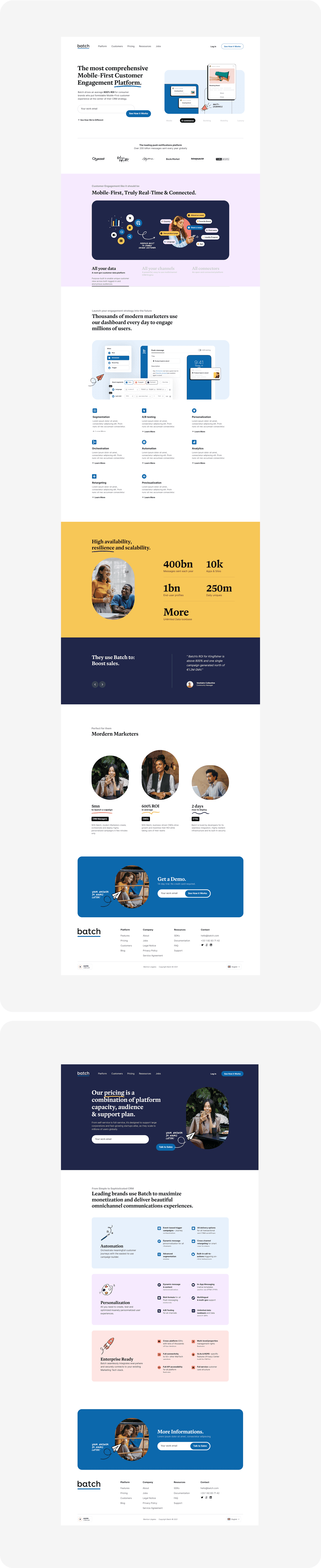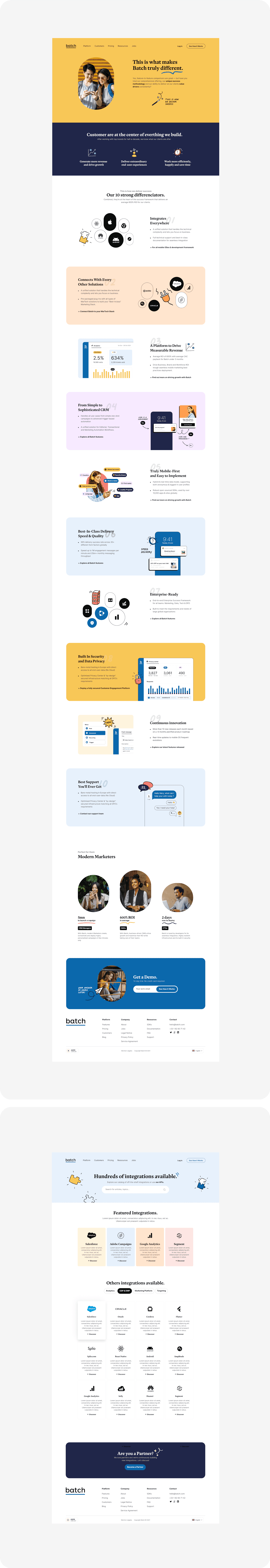 Batch, a platform that makes CRM strategies fast and automated, consulted us for a total redesign of their website and branding. We designed an energetic identity, using a palette of vibrant complementary hues for maximum contrast. The branding emphasizes the human touch through carefully selected photos and freehand illustrations enriching the graphic identity.