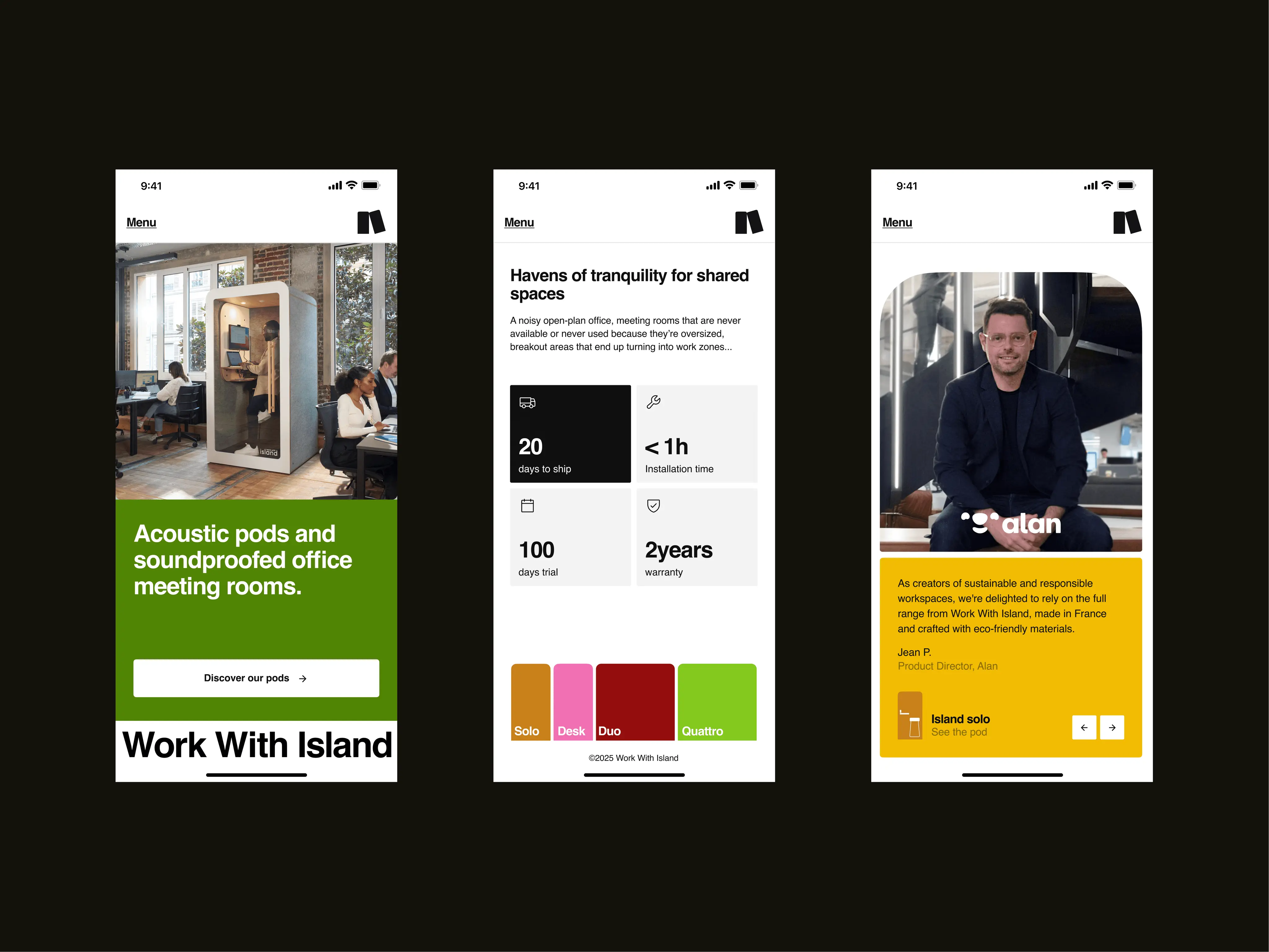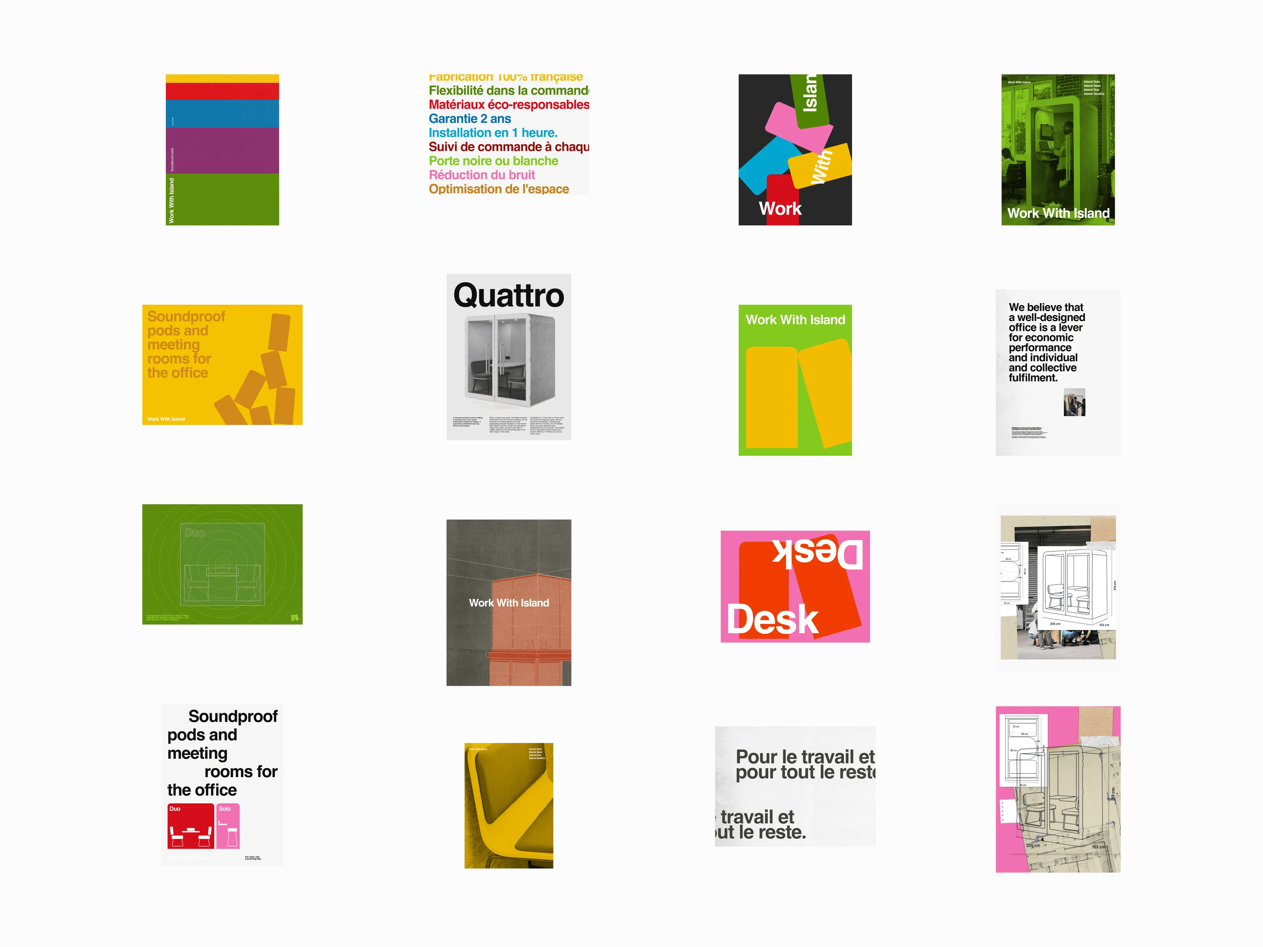 In art direction, our teams drew both from the legacy of Bauhaus, founding school of “design for all”, and from the contemporary codes of mass-market brands. The result: a timeless, grounded logo inspired by everyday icons like Scotch or Tupperware, a palette of bold primary colours, and the world’s most recognisable typeface, chosen for its radical legibility. Playfulness steps in through the graphic language, built around the distinctive rounded form of Work With Island pods. This shape becomes a modular system that can be endlessly reimagined. As for copywriting, it had to carry the voice of leadership: a brand confident enough to lay its conviction on the table.