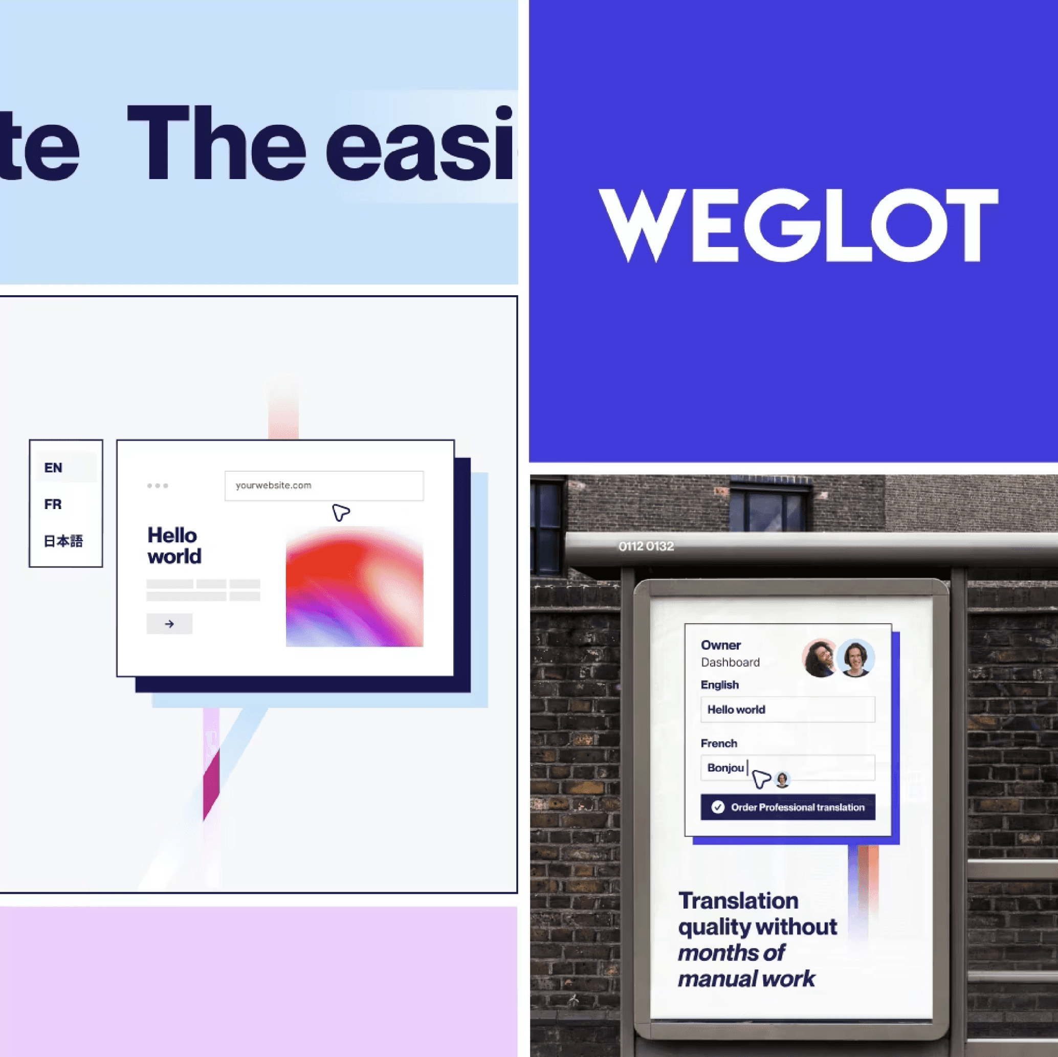 Le logo et les illustrations produits émettent des rayons colorés dynamiques, suggérant la lumière et sa vitesse pour une métaphore de la diffusion multilingue. Le bleu emblématique de Weglot est enrichi de nuances chaleureuses, créant ombres et profondeur. Des micro-animations mettent en avant les atouts de la solution.