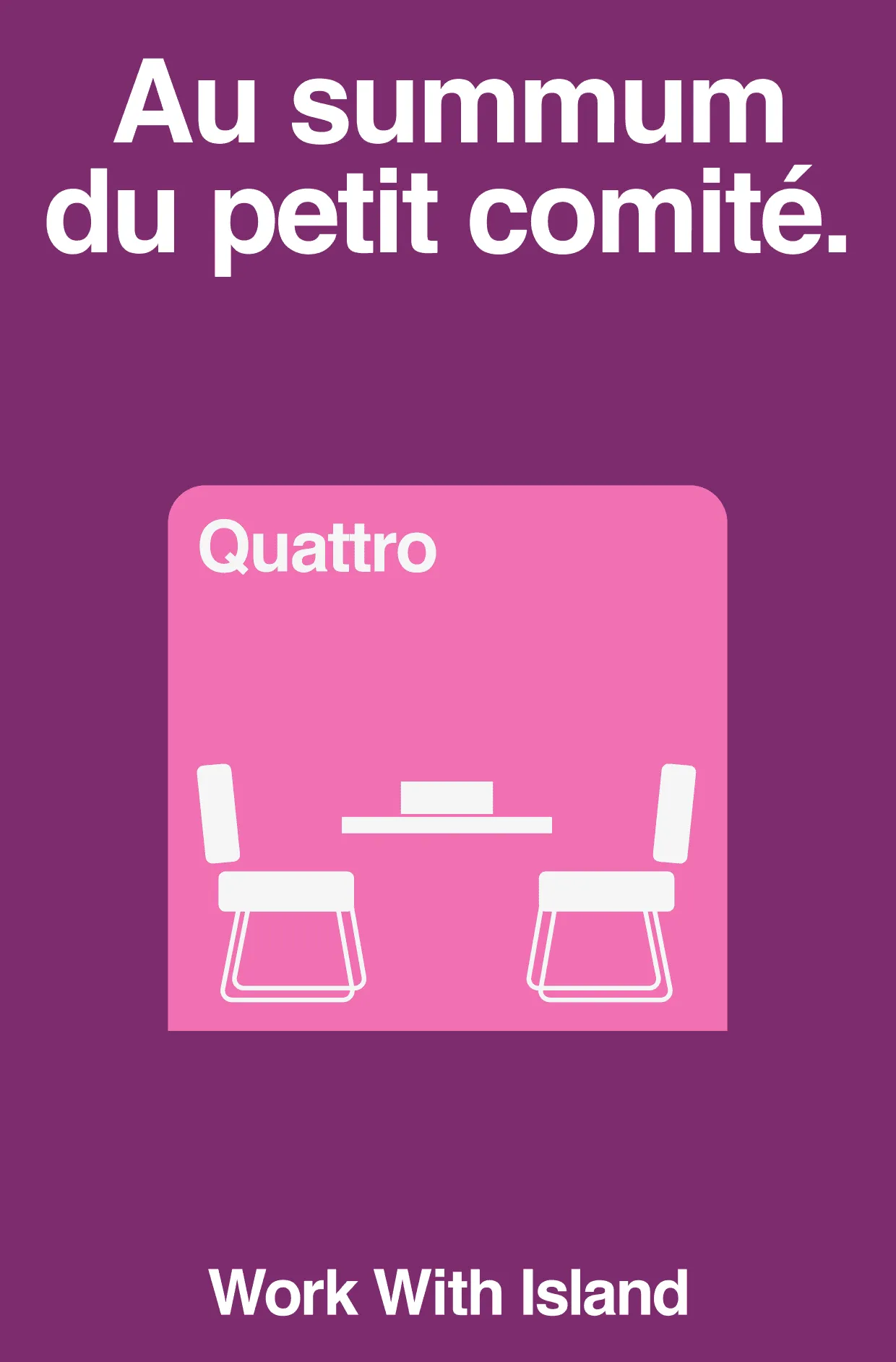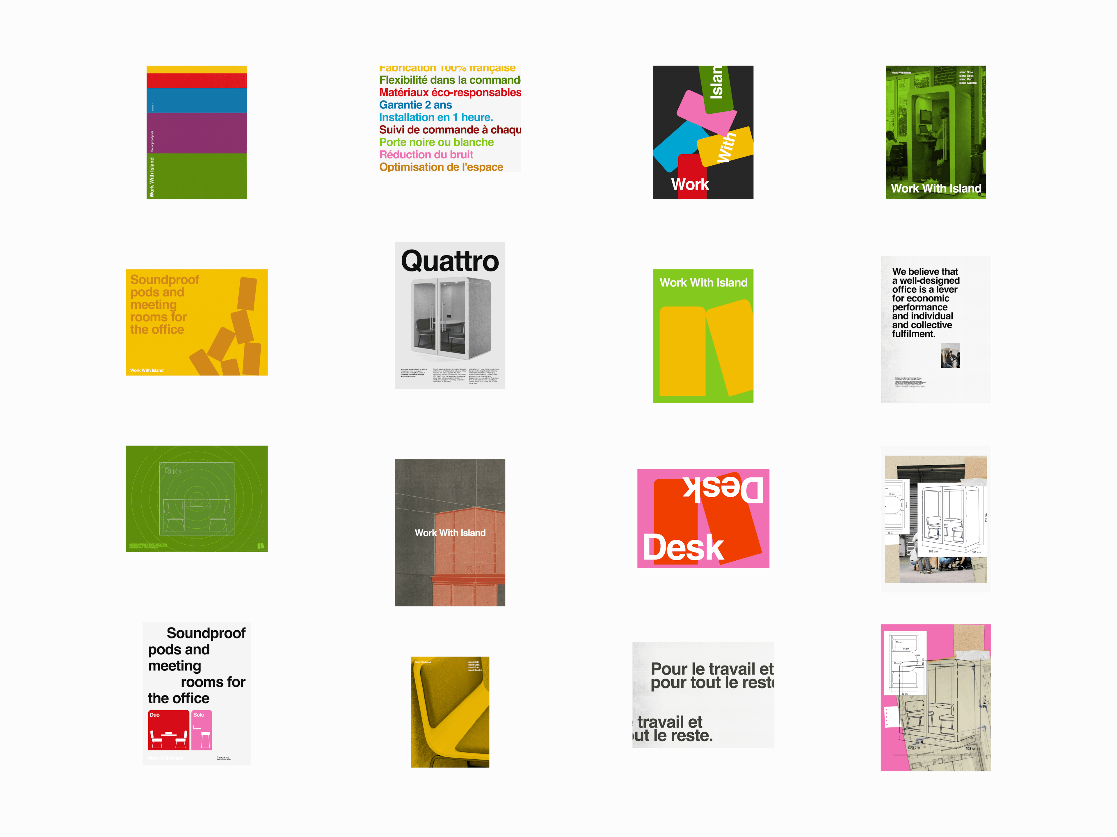 En direction artistique, nos équipes ont à la fois puisé dans l’héritage du Bauhaus, école maître du “design pour tous”, et dans la contemporéanité des marques grand public. Work With Island se dote ainsi d’un logo installé et intemporel, inspiré des grands du quotidien tels Scotch ou Tupperware, de couleurs primaires et franches appairées par teinte, et de la typographie la plus connue du monde, conçue pour une lisibilité radicale. Le jeu intervient avec le langage graphique, fondé sur la forme de la cabine Work With Island qui se démarque de ses concurrentes par ses bords arrondis. On vient démultiplier à loisir cette structure. La conception-rédaction, elle, doit être celle des leaders qui posent leur conviction sur la table.